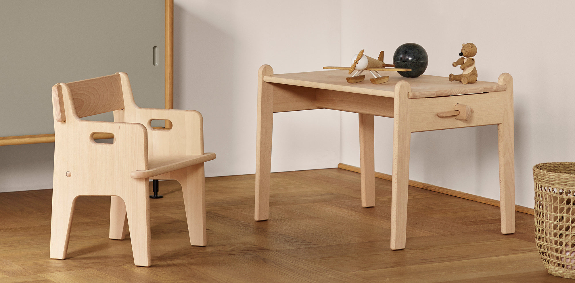 Peter’s table and Peter’s chair are made of untreated solid beech wood. The beechwood becomes beautifully patinated over time but, as it is untreated, it is particularly susceptible to dirt and stains.