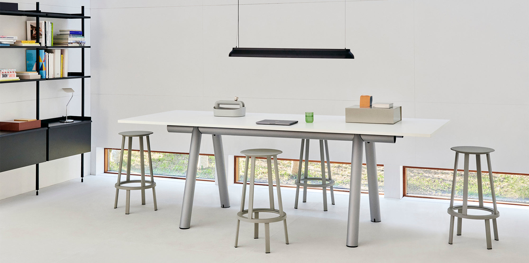 This unique process combined with the lightness of aluminium provides a level of agility rarely present in a table of this scale, enabling its flat-packed design to be easily assembled and moved around. Customisable tabletops are offered in numerous material options, including linoleum, laminate, wood or glass, allowing users to adapt the table to specific style and space requirements.