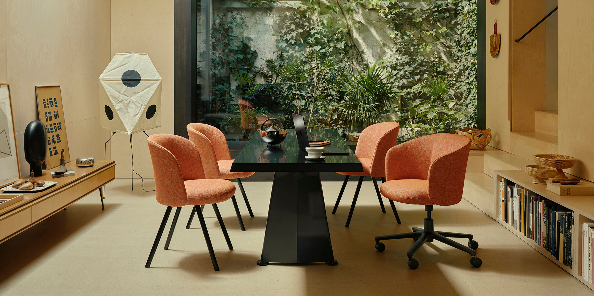 Mikado is available as an armchair with the suggestion of armrests or as a side chair, which each offer a distinctive seating experience and yet are so similar that they can be combined without disturbing the visual harmony around a table or within a given space. Different legs or base options, two backrests, a choice of fabric or leather covers and numerous colours afford a wide variety of possible configurations.