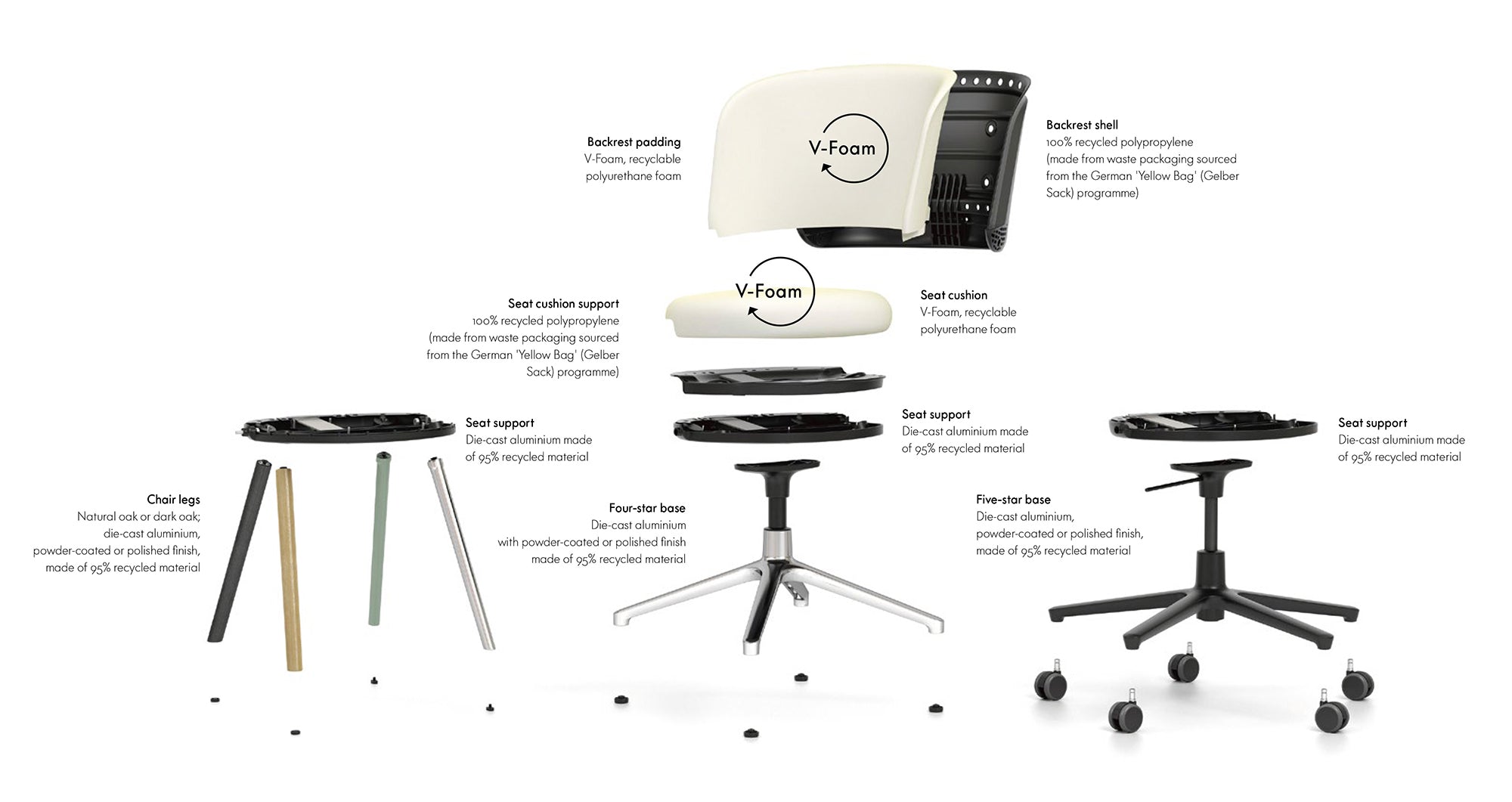 The inner seat panel is made of aluminium with a high recycled content, and the backrest shell is produced from recycled postconsumer polypropylene, which can be easily separated from the foam padding during recycling. The concept of a simple exchange of components gives Mikado longterm versatility, thereby ensuring longevity.